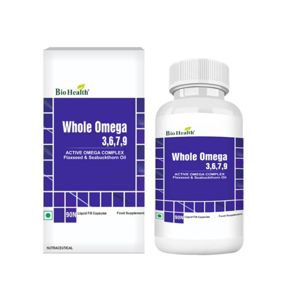 مكمل غذائي. كبسولات سائلة تحتوي على أوميغا 3، 6، 7، 9 كاملة مع مركب أوميغا النشط من زيت بذور الكتان وزيت العنب البحري.