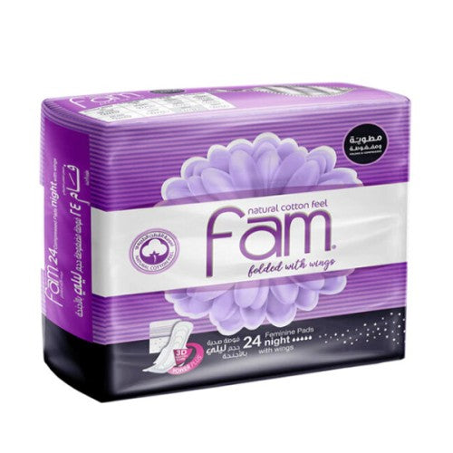 Experience uninterrupted sleep and worry-free nights with FAM Night Size Sanitary Pads with Wings. Specially designed for overnight protection, this 24-count pack delivers superior absorbency and comfort when you need it most. Whether you're dealing with heavy flow or simply want extra security during nighttime hours, FAM has you covered.