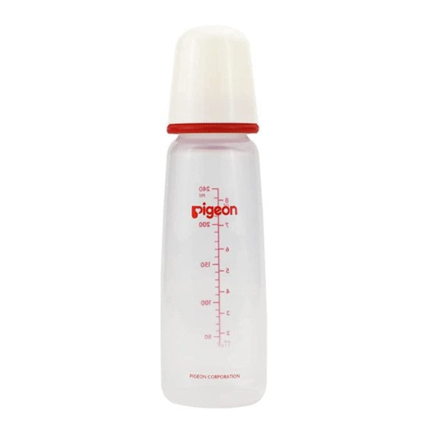 Perfect for feeding your baby on-the-go, this 240ml plastic bottle from trusted brand Pigeon features a secure white lid and durable construction for reliable everyday use. The compact size makes it ideal for travel while providing just the right capacity for infant feeding needs.